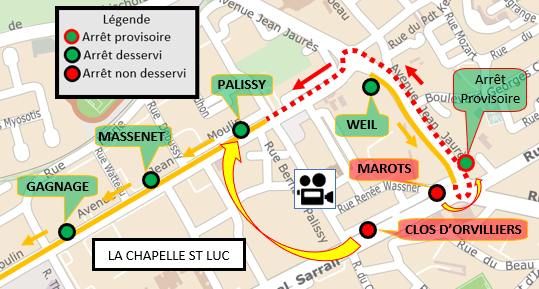 * Les arrêts WEIL , MAROTS et CLOS D ORVILLIERS ne seront pas desservis et seront déplacés vers l'arrêt PALISSY (de la ligne 11, sens Fouchy - Chapelle St Luc vers St Julien)