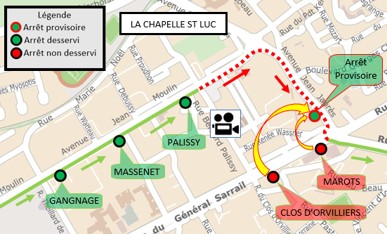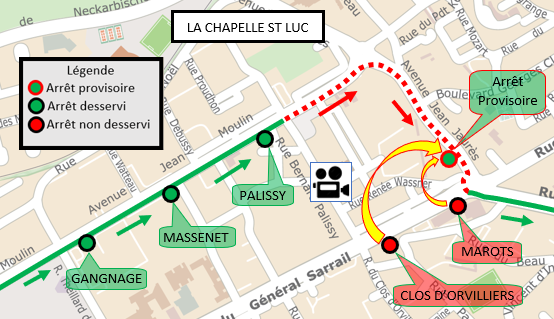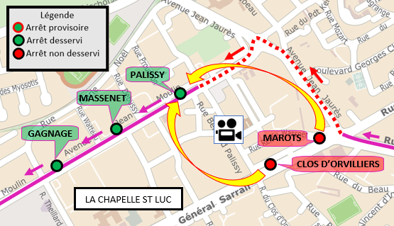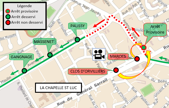 * L'arrêt MAROTS ne sera pas desservi et sera déplacé vers un Arrêt provisoire situé entre le 2 bis et le 4 rue Jean Jaurès à La Chapelle St Luc