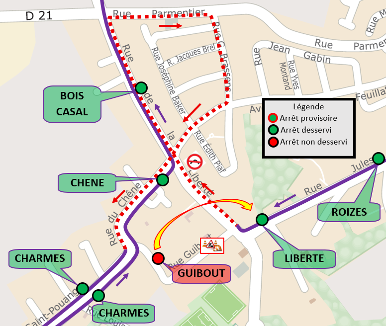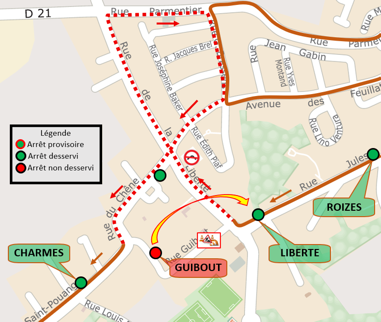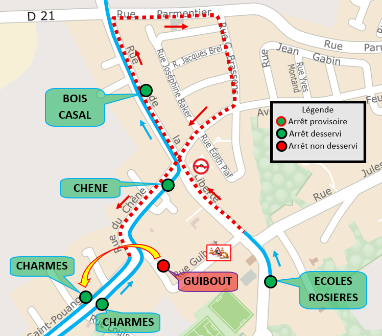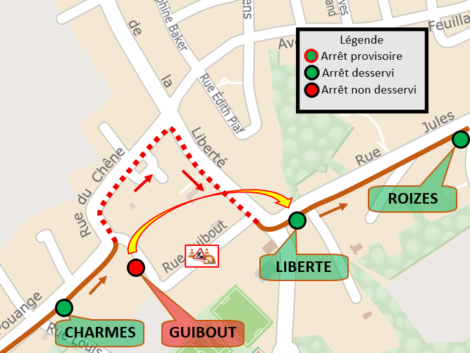 * Les arrêts CHENE et GUIBOUT ne seront pas desservis et seront déplacés vers l'arrêt LIBERTE (de la ligne 8, sens Troyes centre vers Rosières)