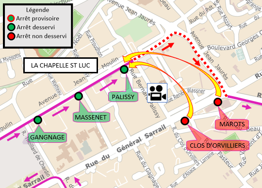 * Les arrêts CLOS D'ORVILLIERS et MAROTS ne seront pas desservis et seront déplacés vers l'arrêt PALISSY (de la ligne 11, sens St Julien vers Chapelle St Luc - Fouchy)
