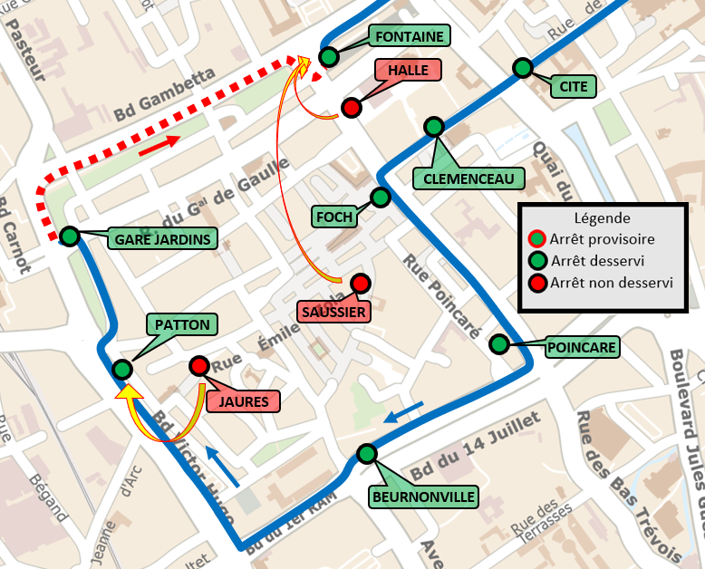 * L'arrêt JAURES ne sera pas desservi et sera déplacé vers l'arrêt GARE PATTON (de la ligne N, sens Navette Coeur de Troyes).
