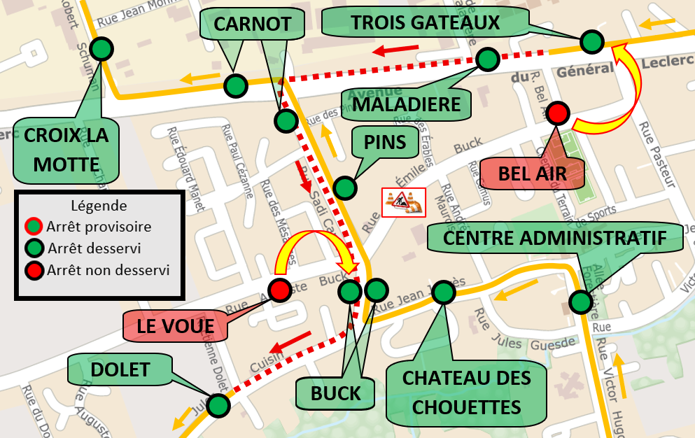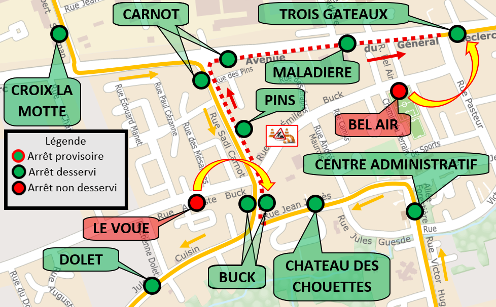 * Les arrêts CHAILLOUET et BERTHOLLET ne seront pas desservis et seront déplacés vers un ARRÊT PROVISOIRE situé au niveau du premier candélabre rue André Malraux depuis l'intersection avec la rue Louis Berthollet.