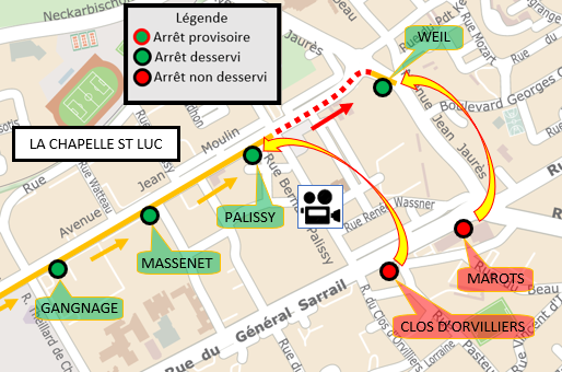 * Les arrêts WEIL et MOZART ne seront pas desservis et seront déplacés vers l'arrêt CAMUS(de la ligne 2, sens Buchères - St Léger vers Chapelle St Luc)