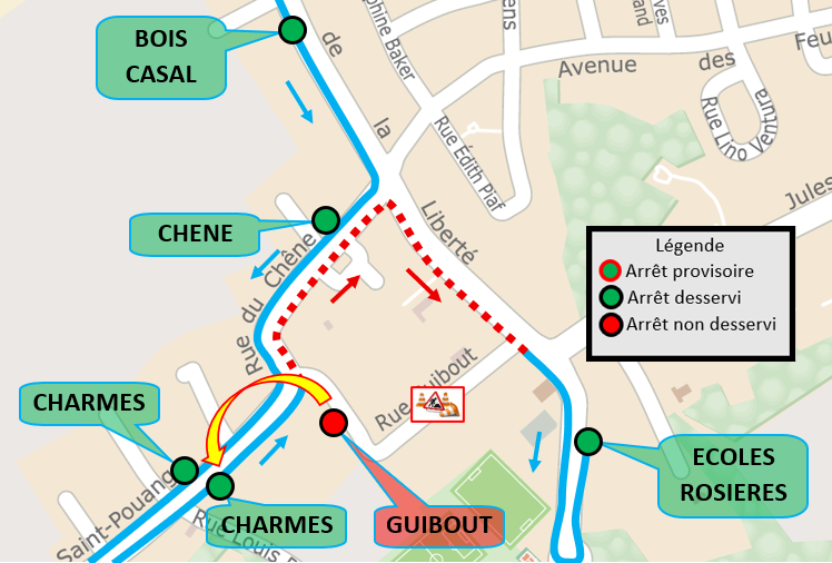 * Les arrêts GUIBOUT et CHENE ne seront pas desservis et seront déplacés vers l'arrêt LIBERTE (de la ligne 8, sens Rosières vers Troyes centre)