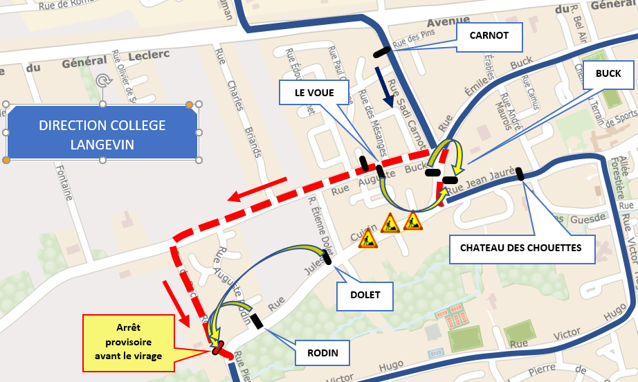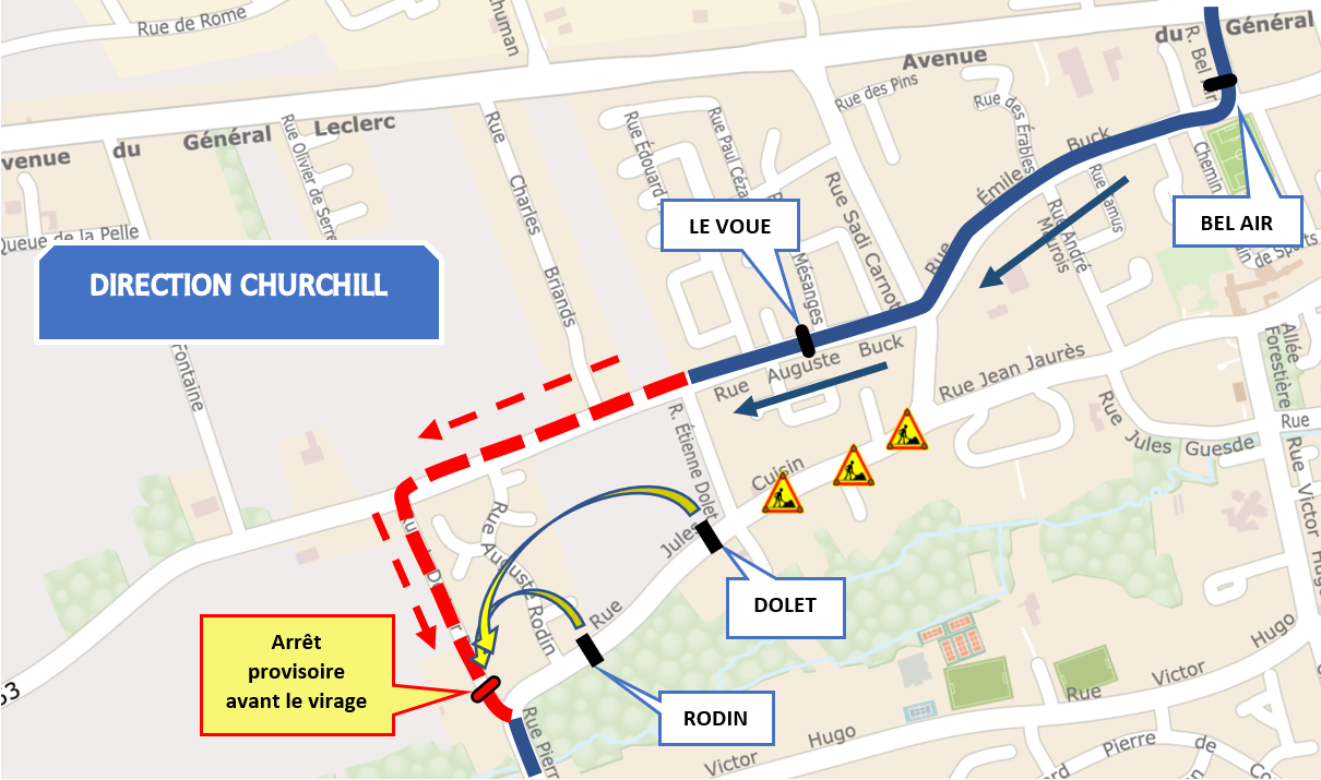 * Les arrêts DOLET et RODIN ne seront pas desservis et seront déplacés vers un ARRÊT PROVISOIRE situé sortie rue du docteur ROUX avant le virage.