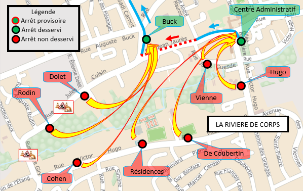 * Les arrêts VIENNE , DE COUBERTIN et RESIDENCES ne seront pas desservis et seront déplacés vers un CENTRE ADMINIST. (de la ligne 1, sens Rivière de Corps vers Pont Ste Marie).