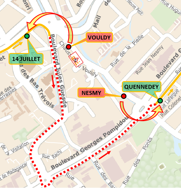 * L'arrêt VOULDY ne sera pas desservi et sera déplacé vers un 14 JUILLET (de la ligne 4, sens Le Hamelet vers St Julien).