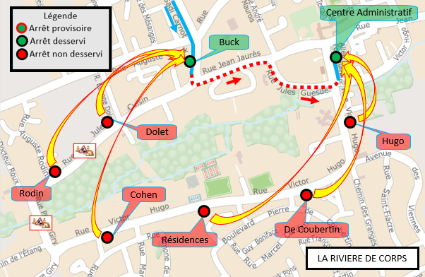 * Les arrêts RESIDENCES , DE COUBERTIN et HUGO ne seront pas desservis et seront déplacés vers un CENTRE ADMINIST. (de la ligne 1, sens Pont Ste Marie vers Rivière de Corps).