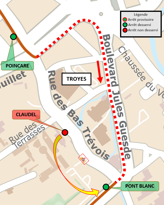 *L'arrêt CLAUDEL ne sera pas desservi et sera déplacés vers l'arrêt PONT BLANC (de la ligne 3, sens Barberey vers St Julien)